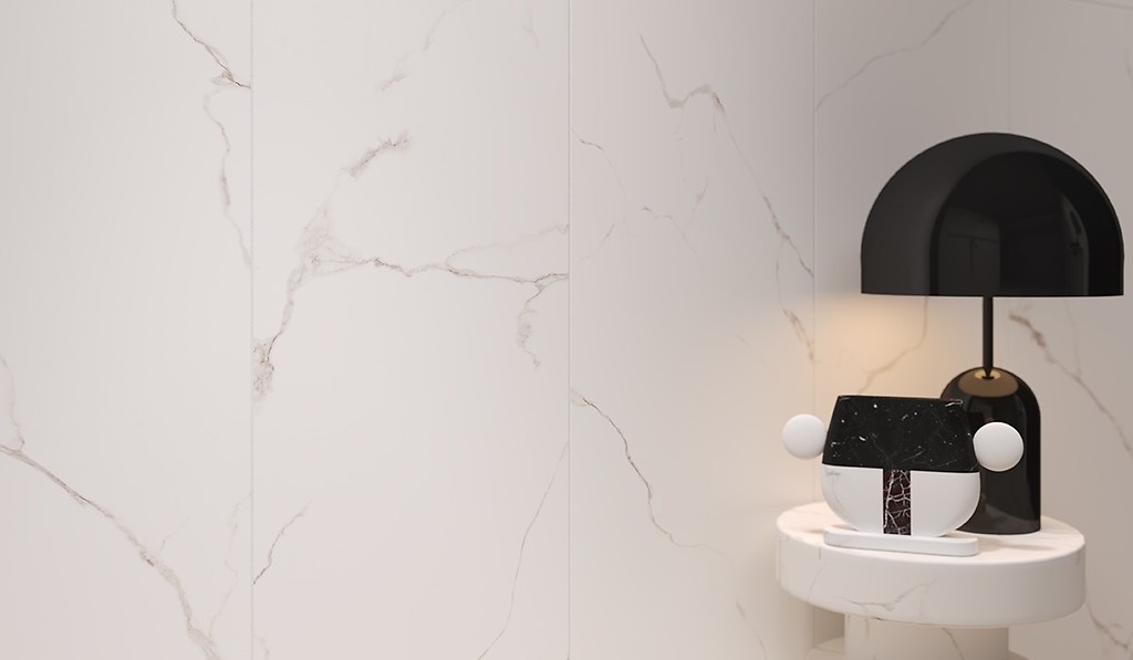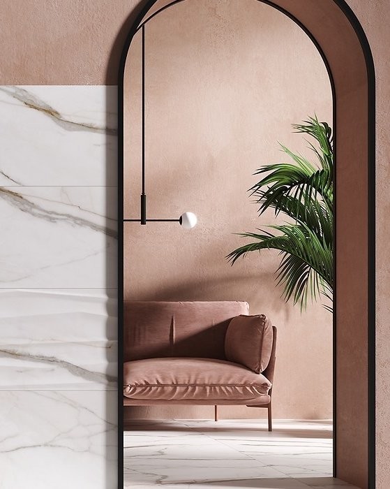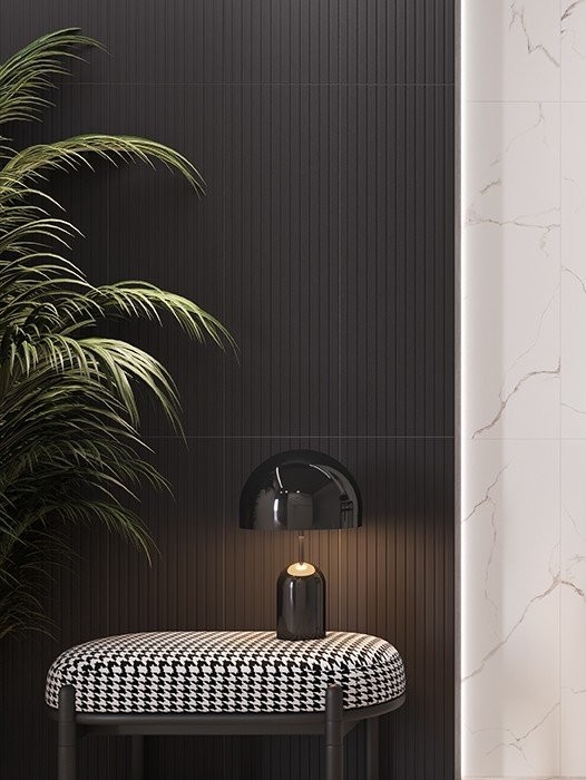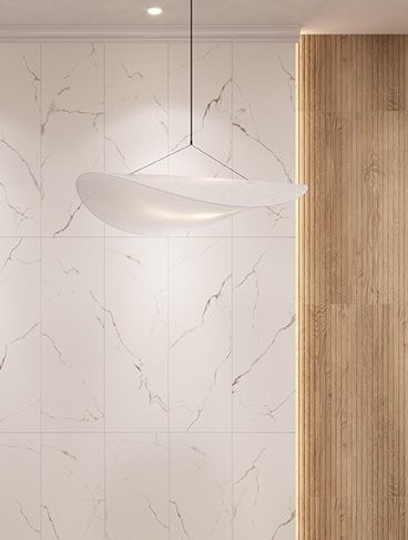 Stonowana kolekcja drewnopodobnych płytek Space Wood o ciepłej, kremowej kolorystyce z subtelną grafiką słoi i sęków stworzy stylowy salon w zestawieniu z marmurowymi płytkami Side Calacatta. Ta kolekcja doskonale odtwarza głębie, połysk i żyłkowanie kamienia Calacatta Quartz i będzie świetnie prezentować się na ścianie z kominkiem.