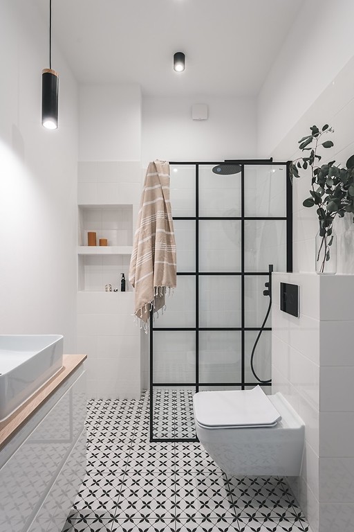 Płytki z kolekcji Patchwork i Monoblock Opoczno w realizacji MakeHomeEasier – piękna łazienka w sopockiej kamienicy
