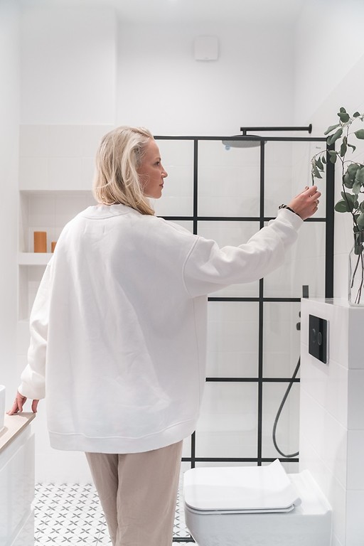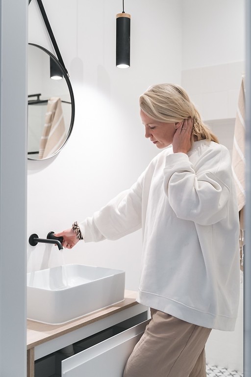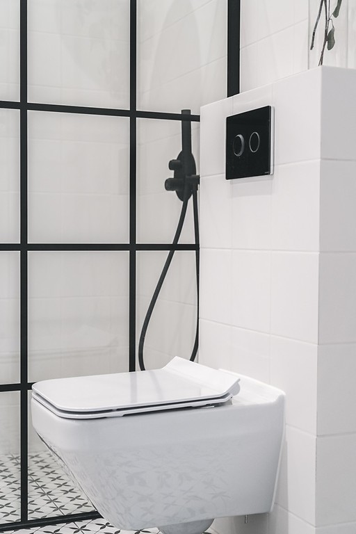 Utrzymana w bieli i czerni aranżacja wnętrza z loftowymi dodatkami oraz akcentami drewna świetnie wpisuje się w charakter miejsca. Projektantkom udało się w wyjątkowy sposób połączyć nowoczesne rozwiązania z klimatem kamienicy. Dominacja bieli i połyskujących powierzchni sprawia, że niewielkie i wąskie pomieszczenie jest jasne i pogodne. Ze względu na kształt łazienki, w głębi umieszona została kabina walk-in. Ścianka prysznicowa z czarnymi profilami i stylowym szprosem doskonale podkreśla charakter projektu. Podobnie, jak dopasowana czarna armatura oraz dodatki, które białej łazience nadają loftowy sznyt. Bazę aranżacji stanowią okładziny ceramiczne. Projektantki wybrały dwie kolekcje z oferty Opoczno: ścienne płytki Monoblock White Glossy, a na podłogę gres Patchwork Clover. Białe płytki Monoblock tworzą uniwersalne tło dla dodatków oraz czarnych akcentów. Ich szkliwiona powierzchnia dodatkowo rozjaśnia i optycznie powiększa wnętrze, a tradycyjny format 20x20 cm doskonale wpisuje się w styl projektu. Podłoga wykończona gresem z kolekcji Patchwork Clover, który zdobi regularny roślinny ornament, to najbardziej dekoracyjny element projektu. Patchworkowy wzór idealnie pasuje do wnętrza w starej kamienicy. W serii Patchwork Concept Opoczno do wyboru jest pięć efektownych wzorów płytek w formacie 30x30 cm: Clover, Flores, Vertigo, Kobe i Naomi. Każda z kolekcji sprawdzi się zarówno we wnętrzach klasycznych, urządzonych w stylu vintage, jak i nowoczesnych.