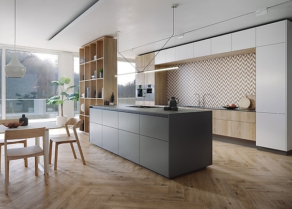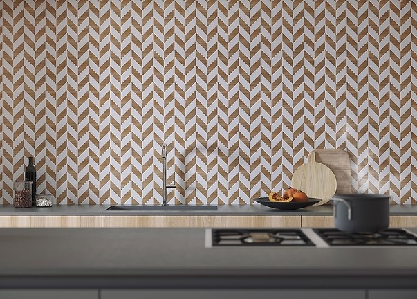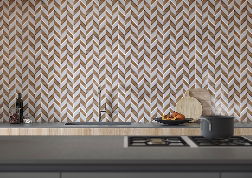 Ponadczasowy charakter modernizmu - stylu, który narodził się w latach 20. ub. w. - sprawia, że również obecnie ma on wielu zwolenników. Zachwyca elegancją, prostotą i niebanalnymi motywami dekoracyjnymi. Ważną rolę odgrywają geometryczne wzory oraz kontrasty. Liczy się dobre wykorzystanie przestrzeni, co w modernistycznych wnętrzach gwarantują pojemne meble, szafy i zabudowy. Rolę dekoracji przejmują starannie dobrane elementy wyposażenia oraz materiały i okładziny o wyrazistych deseniach. Dlatego podłoga o wzorze klasycznej jodełki rewelacyjnie wpisze się w klimat modernistycznego projektu. Ułożone w ten sposób płytki z kolekcji Grand Wood Rustic Light Brown w formacie długich desek (20x120 cm) będą kapitalną bazą. Aby jeszcze bardziej podkreślić modernistyczny charakter projektu, warto sięgnąć po oryginalne mozaiki z kolekcji Love You Navy, które łączą elementy drewnopodobne i białe we wzór jodełki francuskiej. Ten wyrazisty deseń atrakcyjnie zaprezentuje się na ścianie nad blatem w kuchni, gdzie wespół z drewnopodobnym parkietem podkreśli elegancki charakter funkcjonalnej, modernistycznej przestrzeni.