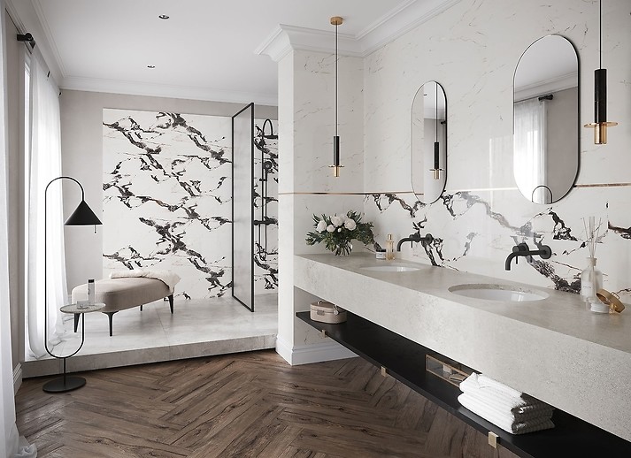 Styl klasyczny to jeden z najpopularniejszych kierunków w urządzaniu. Klasyczne wnętrza są eleganckie i ponadczasowe między innymi dzięki szykownym materiałom, urokliwym sztukateriom oraz zdobnym detalom. Urok klasyki znakomicie oddaje połączenie rysunku wytwornego kamienia oraz drewna. Płytki ścienne z kolekcji Santis o mocnym rysunku inspirowanym marmurem będą prezentować się fenomenalnie w klasycznie urządzonej łazience. Stylowy efekt wzmocni podłoga o wzorze drewna z płytek Passion Oak Cold Beige formacie desek (15x90 i 22x90 cm), ułożonych we wzór jodełki angielskiej. Takie wykończenie, w nieco chłodniejszej tonacji beżu, pozostawia wiele dekoratorskiej swobody, a całość efektownie dopełnią zarówno akcenty postarzanego złota, jak też awangardowej czerni.
