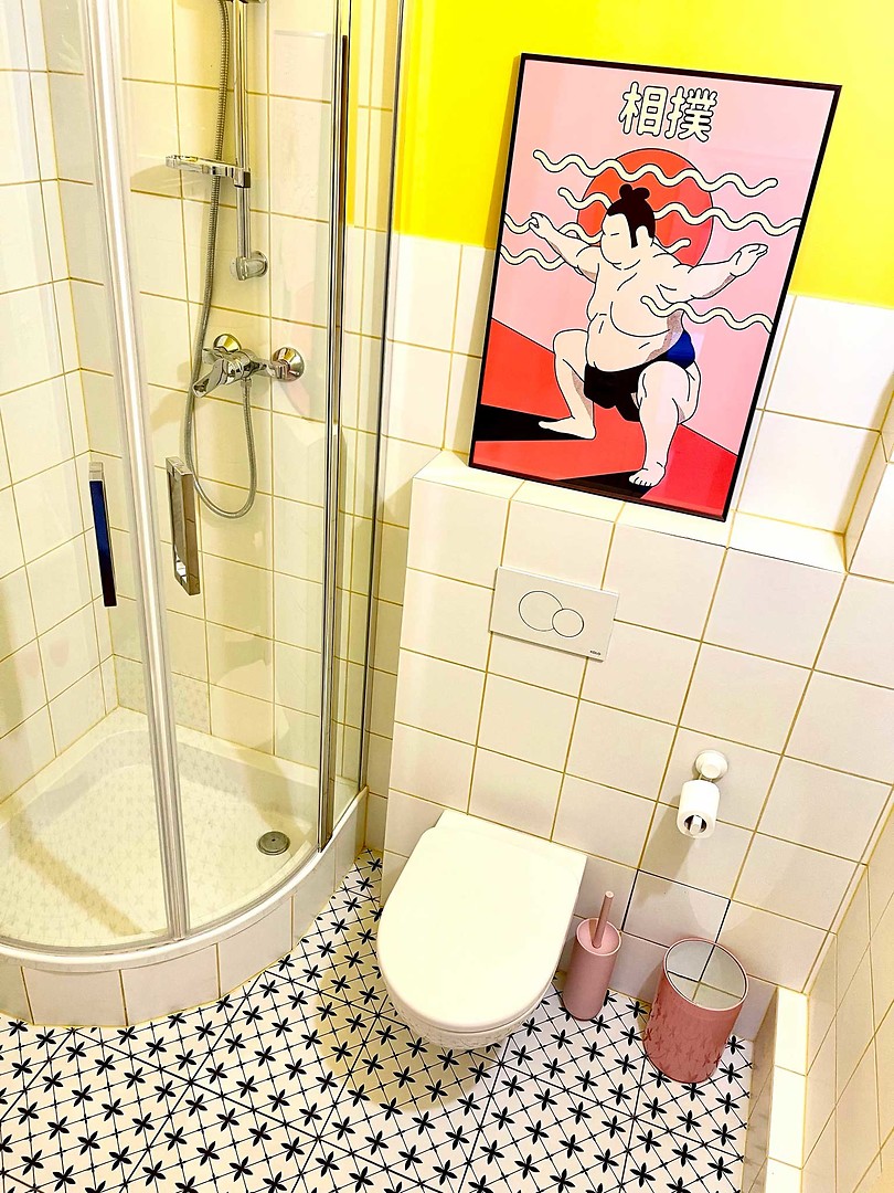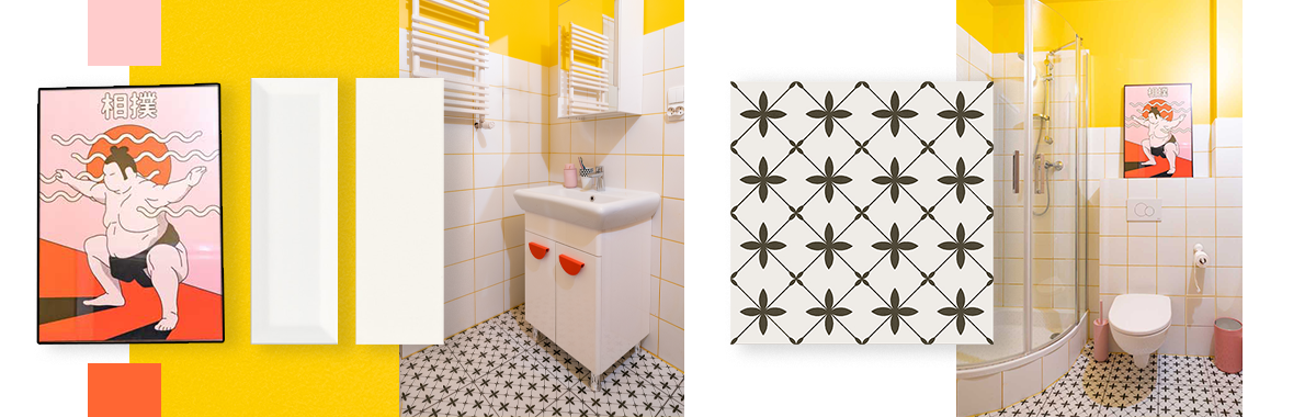 Ewa do łazienki wybrała kafle Patchwork Clover Mirage. - Ich czarno-biała grafika świetnie koresponduje z intensywną żółtą barwą ścian i fugi – wyjaśnia. Minimalistyczną bazę projektu tworzą proste białe kafle ścienne Monoblock ułożone do połowy ścian. Wzorzysty deseń patchworkowych płytek stanowi mocny akcent, ale nie dominuje, dlatego we wnętrzu jest miejsce na wyraziste dekoracje.