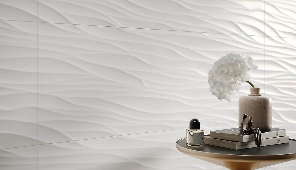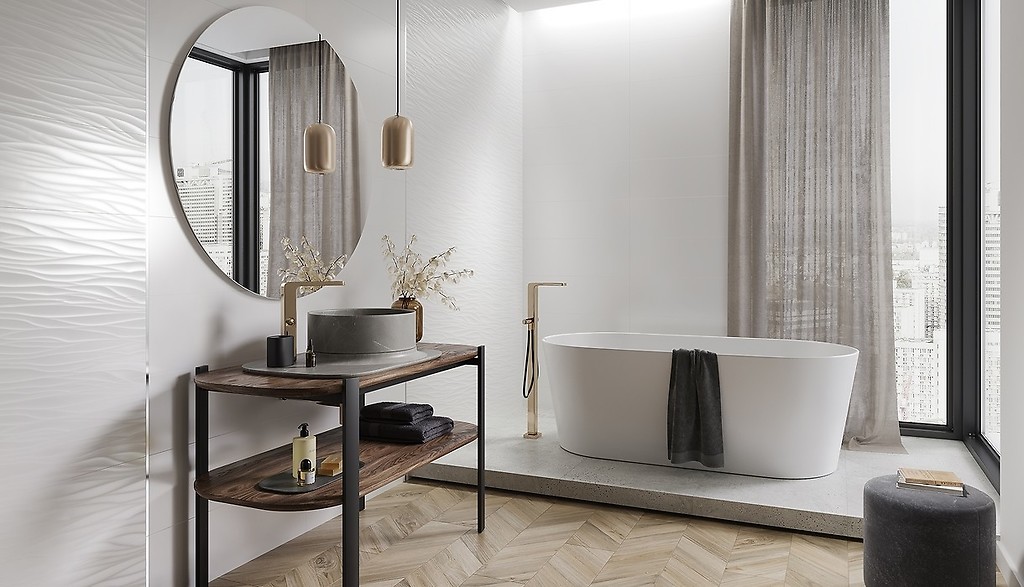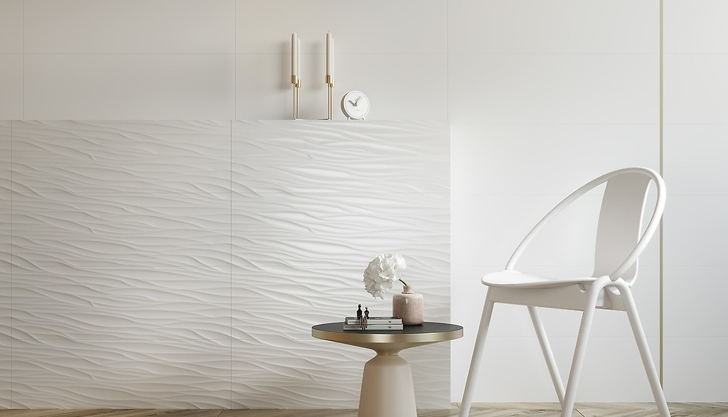 Warto postawić na jasną kolorystkę, zwłaszcza klasyczną biel, która rozświetli i wizualnie powiększy przestrzeń. Ale należy przy tym zadbać o urozmaicenie powierzchni i wprowadzić dekoracyjne „zamieszanie”. Świetnie zaprezentuje się połączone malowanych na biało ścian z płytkami ceramicznymi o przyciągającej wzrok fakturze. Taką mają płytki z kolekcji Ola Bianca. Ich nieregularna powierzchnia wydaje się delikatnie falować. Wystarczy wykończyć w ten sposób jedną ze ścian lub jej fragment, aby przedpokój zachwycał nietuzinkową oprawą. Faktura płytek zgrabnie przełamie jednolitą płaszczyznę ścian i pozwoli dojść do głosu atrakcyjnej grze światła odbijającego się od ich satynowej powierzchni. Taka oprawa doskonale wpisze się m.in. w klasyczny styl aranżacji. Będzie znakomicie korespondować ze stylowymi sztukateriami oraz parkietem w jodełkę. Doskonale w tej roli sprawdzą się gresy z kolekcji Wood Chevron. Tę samą kompozycję ścienną możemy z powodzeniem zastosować również w nowoczesnej konwencji. Dobierając do białych ścian gresy podłogowe o wzorze betonu z kolekcji Newstone stworzymy współczesną aranżację. Charakter przestrzeni dobrze uzupełni duże lustro bez ramy czy prosta konsola na metalowym stelażu.